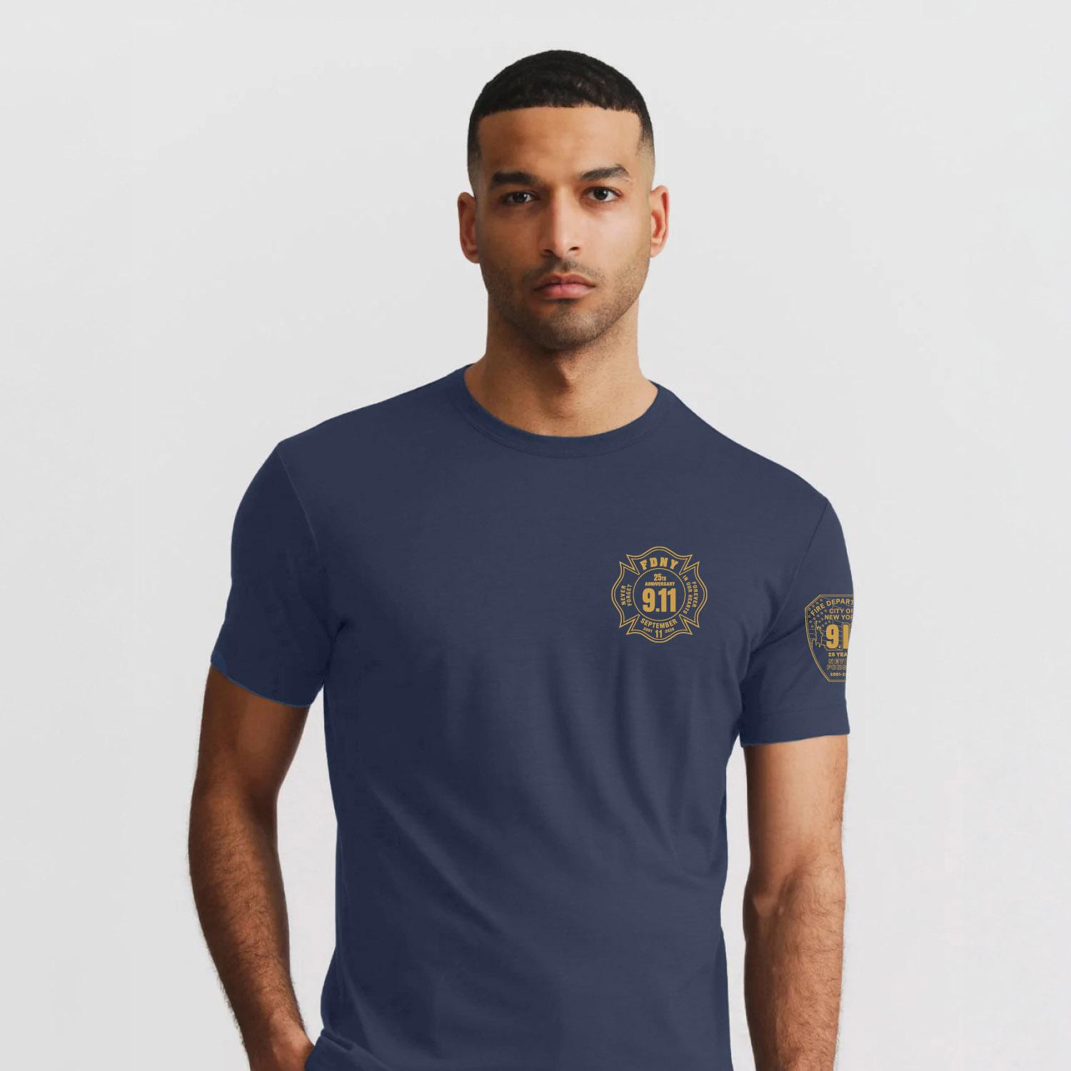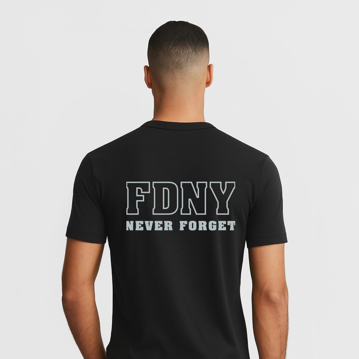 Featuring the 25th Anniversary 9/11 emblem on the front chest and left sleeve, along with a bold FDNY / NEVER FORGET design across the back, this commemorative tee offers a respectful and timeless tribute. Available in Navy with gold ink, Black with gold ink, and Black with silver ink.