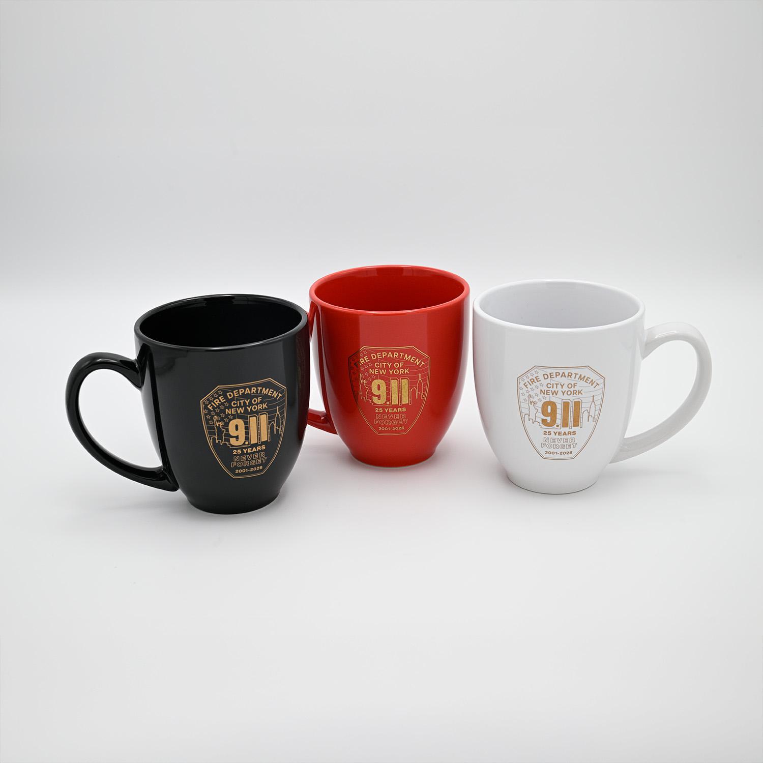Designed with the commemorative 9/11 25th Anniversary shield on the front, this ceramic mug is a meaningful way to reflect, remember, and show support. Its rounded shape, glossy finish, and comfortable handle make it ideal for everyday use. Available in Black, Red, or White, each featuring the same gold-style emblem.