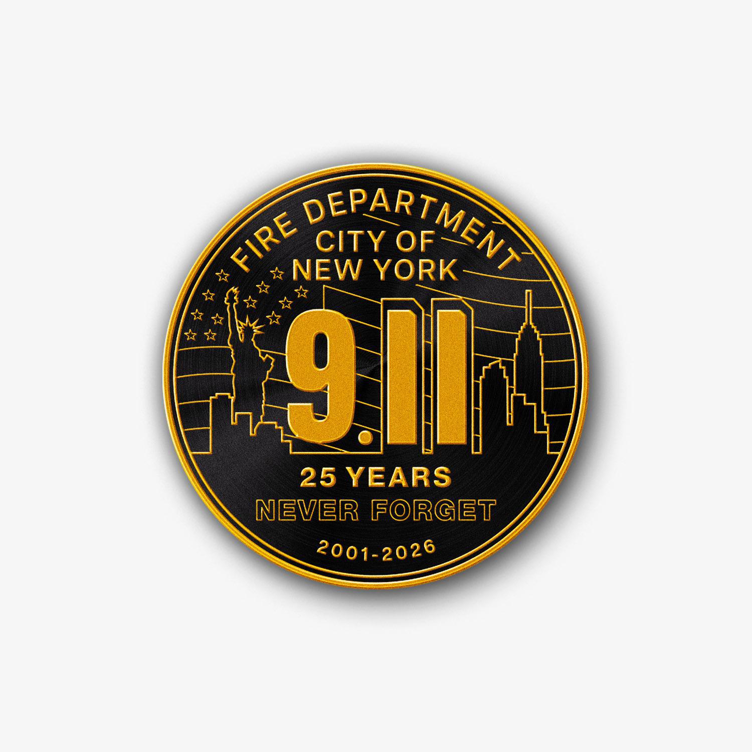This commemorative two-sided coin features the official FDNY 9.11 25th Anniversary artwork in striking gold and black. A meaningful collectible that honors the lives lost and the heroes who responded.