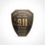 - Front: FDNY 9.11 25th Anniversary shield with skyline and “Never Forget”