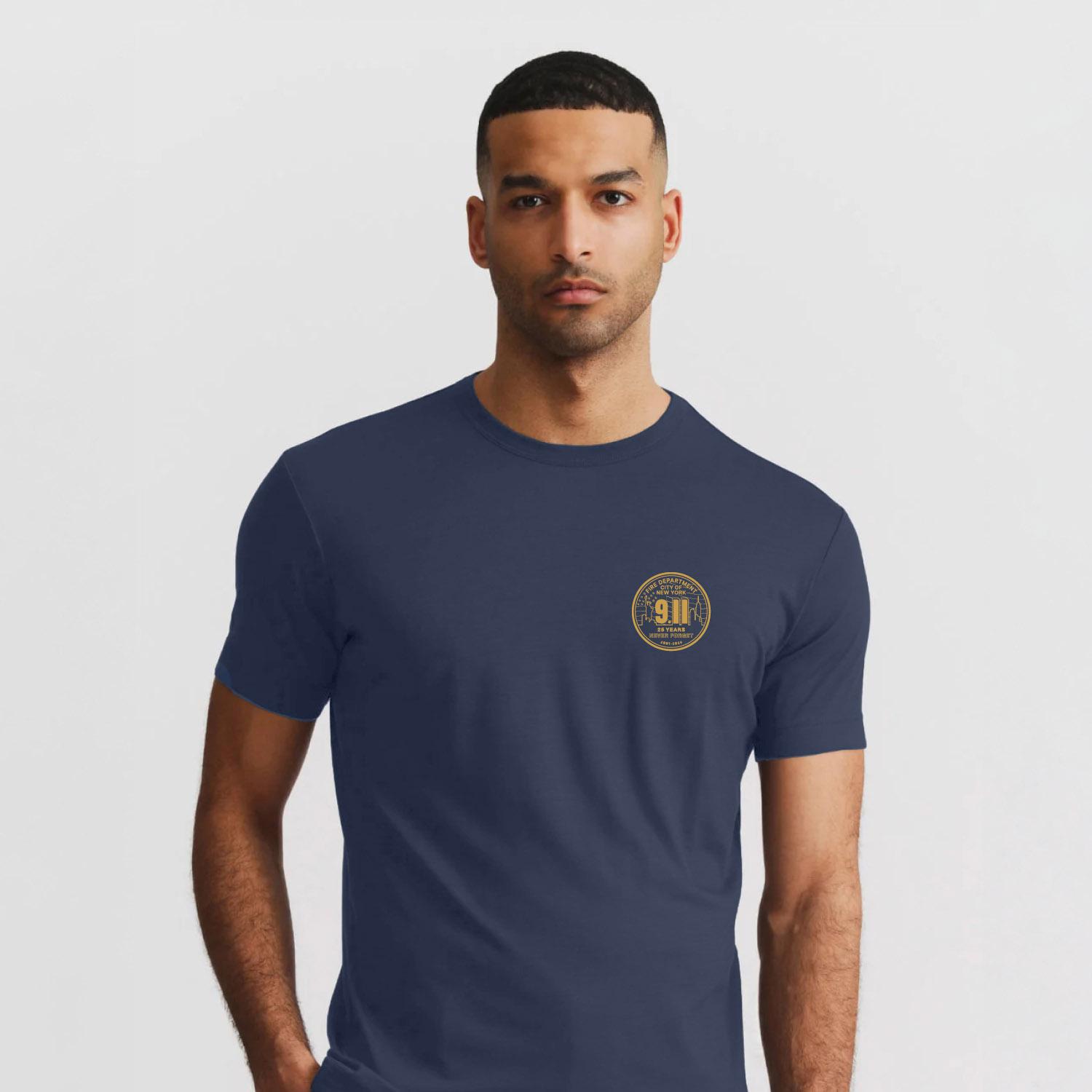 The front features the circular FDNY 9.11 25th Anniversary emblem, while the back displays a bold FDNY / NEVER FORGET design. A clean, impactful tribute available in Black or Navy with a gold imprint.