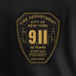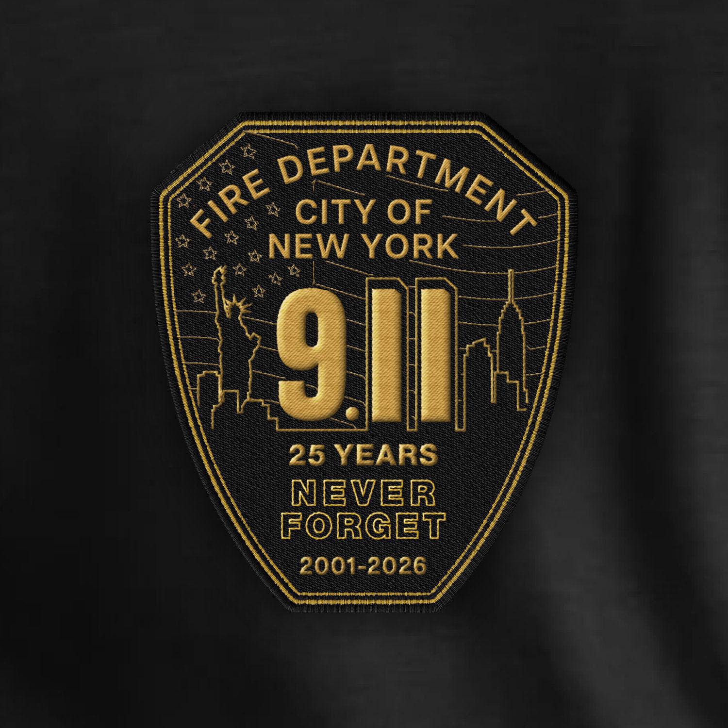 - Design: FDNY 9.11 25th Anniversary shield with gold embroidery-style detailing