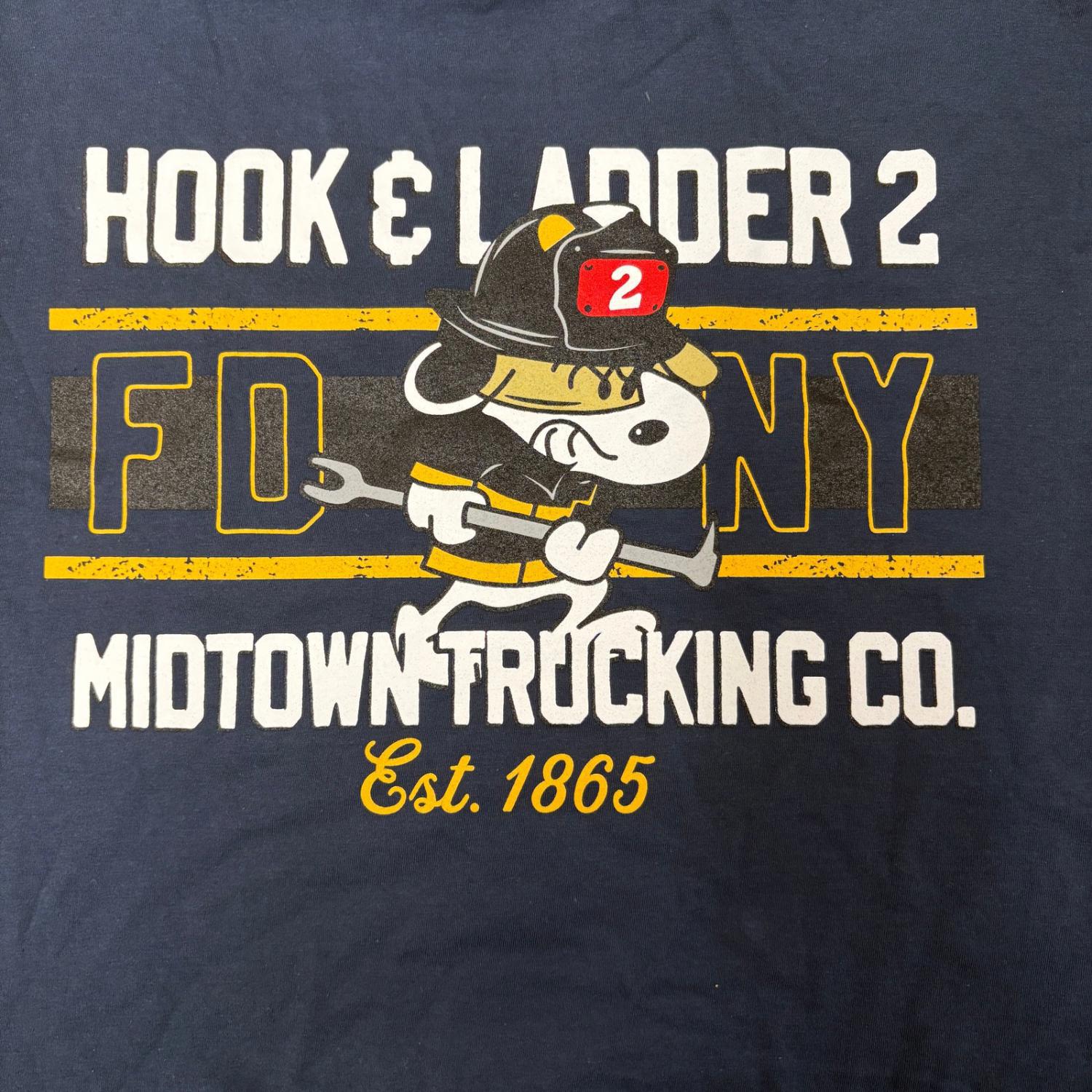 Featuring Snoopy suited up as a firefighter with bold “Hook & Ladder 2 – Midtown Trucking Co.” graphics on the front and a classic FDNY Maltese cross on the back, this tee honors Ladder 2’s high-rise expertise and proud Midtown roots.